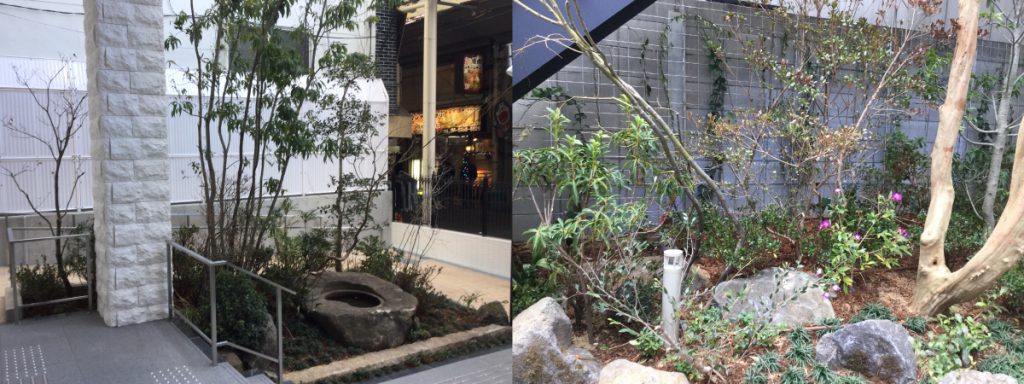 洗練された空間の奥に見える庭園には、様々な植物が植えられており